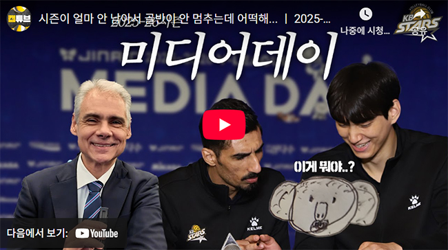 2025-26시즌 시작을 알리는 미디어데이에 감독님, 야쿱, 성진이 다녀왔습니다! 우당탕탕 팀 구호 외치기와 성진이가 그린 감독님 닮은 꼴은?! 지금 바로 시청 가능합니다! 구단 홈페이지 https://www.kbstarsvc.co.kr 인스타그램 https://www.instagram.com/kbstarsvc 네이버 TV https://tv.naver.com/kbstarsvc 네이버 블로그 https://blog.naver.com/kbstarsvc |