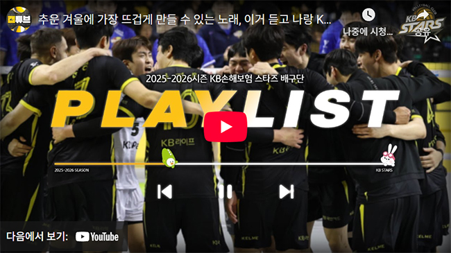 ★스타즈 선정★ 직관 오기 전에 꼭 들어야 할 노래 1위!! 2025-2026시즌 KB손해보험 스타즈 배구단의 팀 응원가부터 선수 응원가까지! 신규 응원가부터 익숙한 응원가 모두 담았습니다♬ (+공개되지 않은 선수들의 프로필 사진은 보너스♡♥) 구단 홈페이지 https://www.kbstarsvc.co.kr 인스타그램 https://www.instagram.com/kbstarsvc 네이버 TV https://tv.naver.com/kbstarsvc 네이버 블로그 https://blog.naver.com/kbstarsvc |