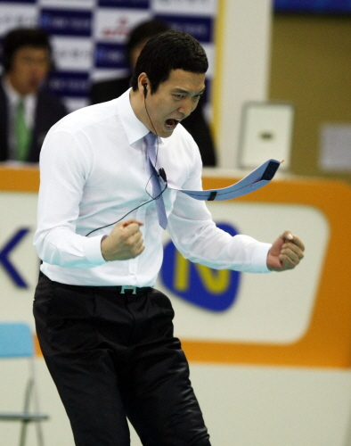 LIG 손해보험 김상우 감독이 '4-4-3 배구'로 팬들에게 인사를 했다. 정식감독으로 나선 첫 무대인 28일 현대캐피탈전에서 매 세트 듀스의 접전끝에 3대0의 짜릿한 승리를 거뒀다.
