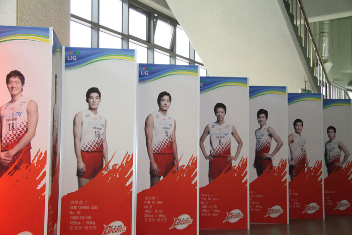 LIG손해보험 배구단의 구미 홈구장 2층 복도에는 기념 촬영을 원하시는 팬들을 위해 선수단의 포토월을 설치했습니다. 반짝반짝 눈이 부시는 LIG손해보험 배구단의 꽃미남 선수들의 사진 옆에서 즐거운 기념 촬영을 해보세요.