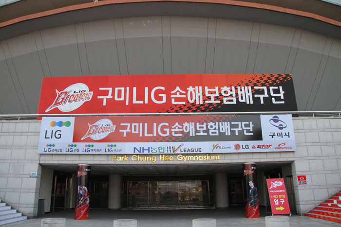 LIG손해보험 배구단의 홈구장인 구미 박정희 체육관 입구들에 들어서면 타 구단의 홈구장에서는 찾아 볼 수 없던 특별한 공간을 찾아 볼 수 있습니다.