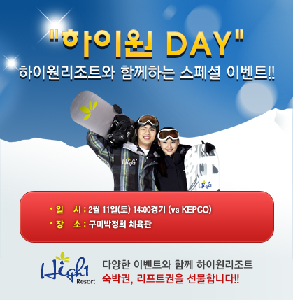 LIG손해보험 배구단(www.LIGsports.co.kr)은 2월 11일, 구미 홈경기에서 하이원리조트와 함께 “하이원DAY” 행사를 진행한다.