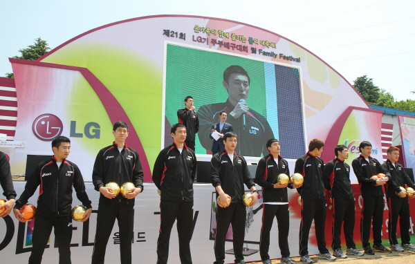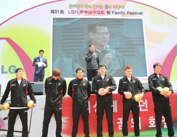 올해 주장 하현용 선수가 대회 축하 인사를 하고 있다. 선수들은 직접 금색볼에 사인하여 팬들에게 나눠 주었습니다.