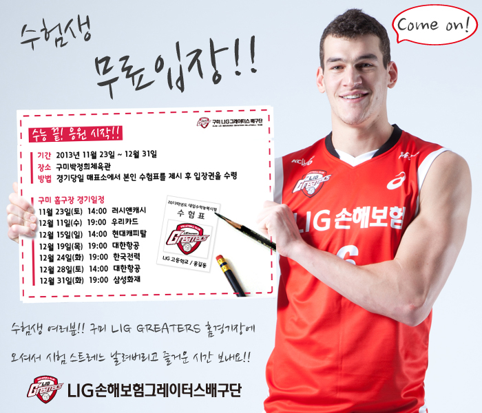 오는 11월 23일(일) 경기부터 수능생 무료입장 이벤트를 실시합니다. 대학 입시를 준비하면서 받는 스트레스 LIG 경기장에 오셔서 선수들의 멋진 플레이와 재미있는 응원을 통해 날려버리세요! 본인 수험표 꼭 챙겨서 경기 당일날 매표서 옆 부스 담당자에게 보여주시고 할인 티켓 수령하시면 됩니다.