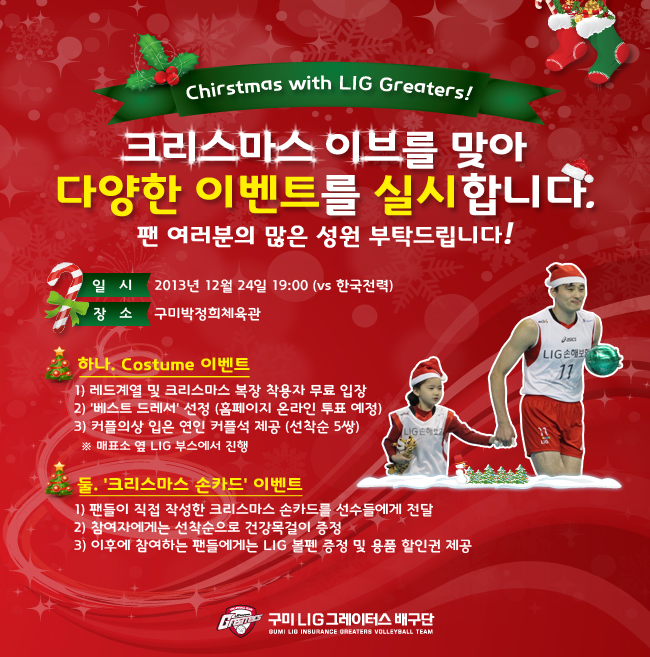 이밖에도 LIG배구단은 여러가지 행사를 통해 홈팬들을 위한 특별한 크리스마스 이브의 추억을 기획하고 있으니 많은 참여 부탁드립니다.