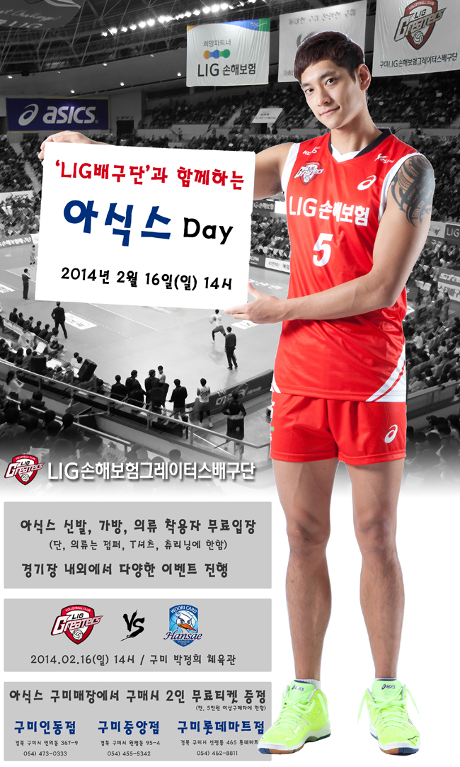 오는 2월 16일(일) 오후 2시 구미 박정희 체육관에서 우리카드와의 경기를 구단 후원사인 아식스코리아와 함께 “아식스 DAY”를 Main 이벤트로 정하여 실시합니다.