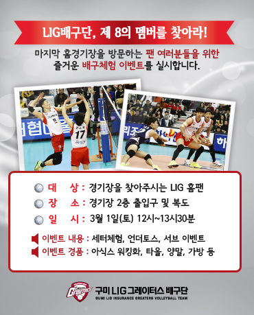 또한, 경기전에는 “LIG배구단 제8의 멤버를 찾아라!”라는 실제 배구체험 행사를 구미 박정희 체육관 2층 입구쪽에서 실시한다.