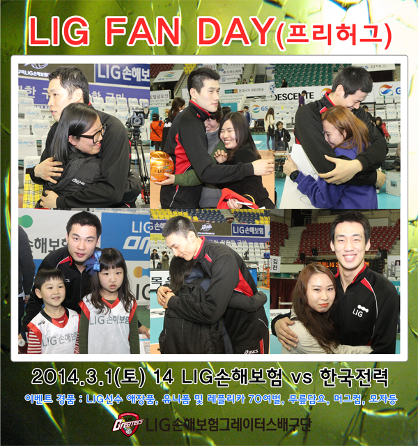 LIG손해보험 배구단(단장 박주천)은 3월 1일(토, 14시) 2013-14시즌 마지막 구미 홈경기장을 방문하는 팬들을 대상으로 ‘LIG FAN DAY(프리허그)’를 실시합니다.