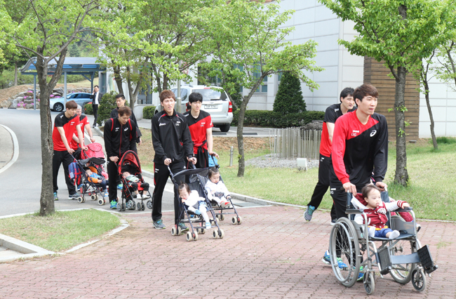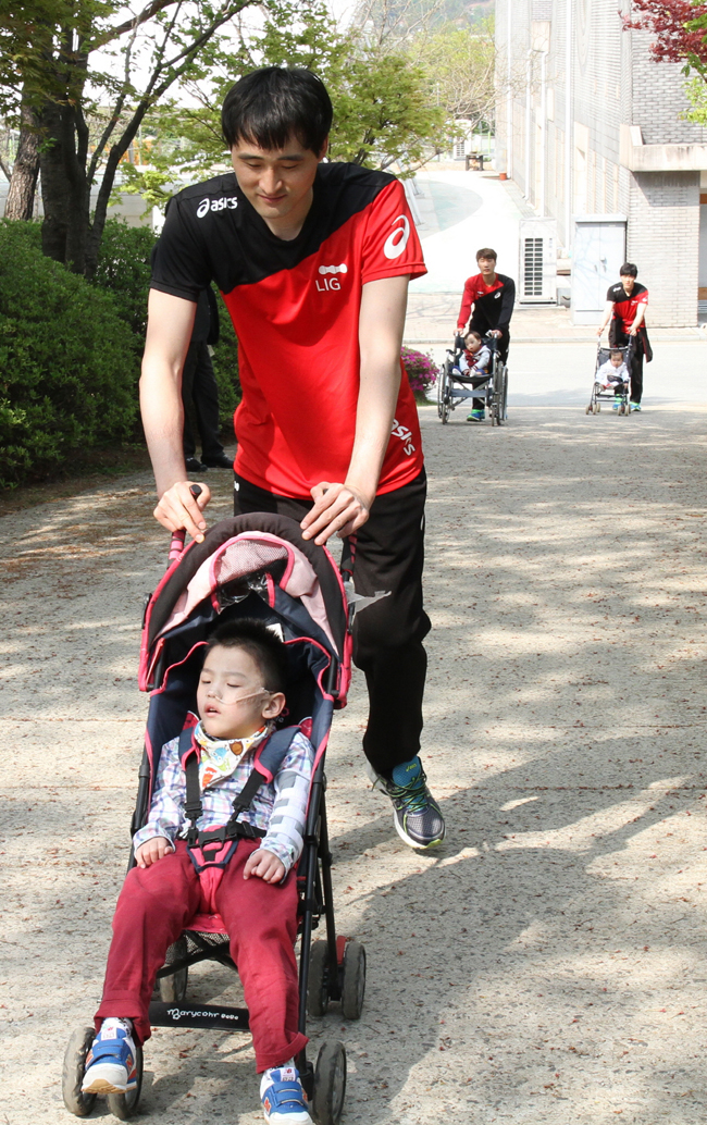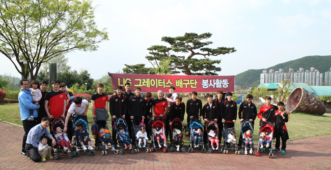 이번 행사는 지난 20일 ‘장애인의 날’을 맞이하여 평소에 외부활동이 힘든 영유아원 아이들과 LIG배구단 선수들이 3인 1조로 조를 이루어 곤지암 소재 ‘도자공원’을 산책하며 즐거운 시간을 보냈습니다.