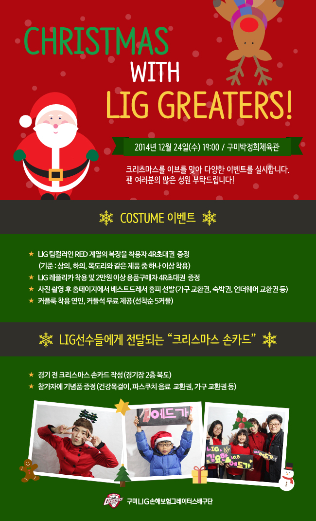 그리고 경기중에는 선수단 입장시 특별 크리스마스 기념품을 나눠주며 경기 중간중간 다양한 크리스마스 이벤트로 팬 여러분들의 눈과 귀를 즐겁게 해드릴 예정입니다.