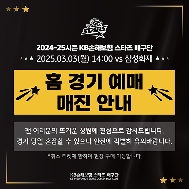 3월 3일 vs삼성화재 홈 경기 예매 매진 안내