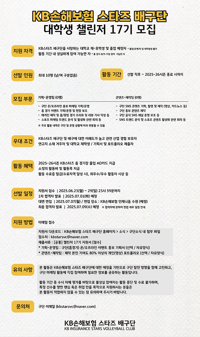 KB스타즈 배구단을 사랑하는 대(휴)학생 및 졸업 예정자, 활동 기간 내 성실하게 참여 가능한 자 모두 지원 가능하오니