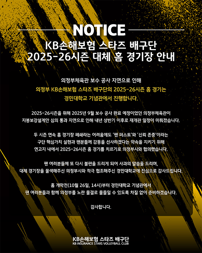 KB손해보험 스타즈 배구단 2025-26시즌 대체 홈 경기장 안내