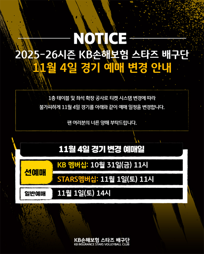 2025-26시즌 KB손해보험 스타즈 배구단 11월 4일 경기 예매 변경 안내