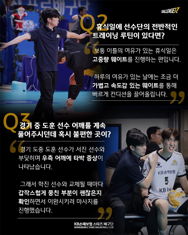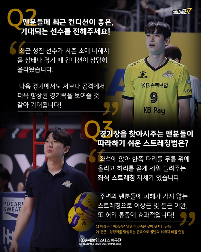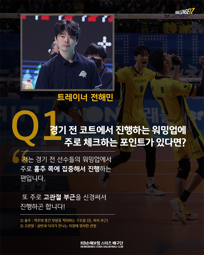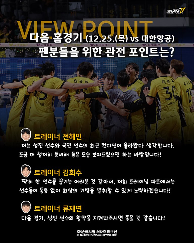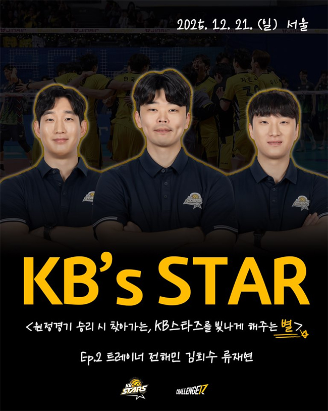 그 두번째 주인공은 전해민, 김희수, 류재연 트레이너님입니다!✨ 매 원정경기 승리 시마다 감독/코치진, 선수단, 팬 여러분 등 KB스타즈와 함께하는 누구든 챌린저17기가 찾아갑니다🏃➡️ 지난 3R 우리카드전 찾아간 트레이너님들, 그리고 과연 다음 원정길의 KB’s STAR 주인공은 누구일지~? #KB손해보험스타즈배구단 #남자배구 #KB스타즈 #전해민 #김희수 #류재연 #챌린저17기 #KBsSTAR |