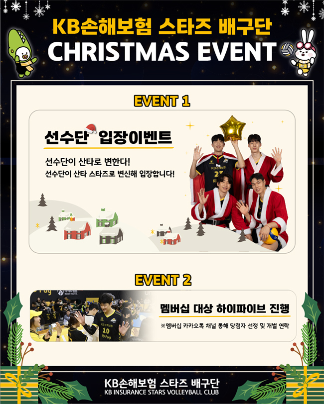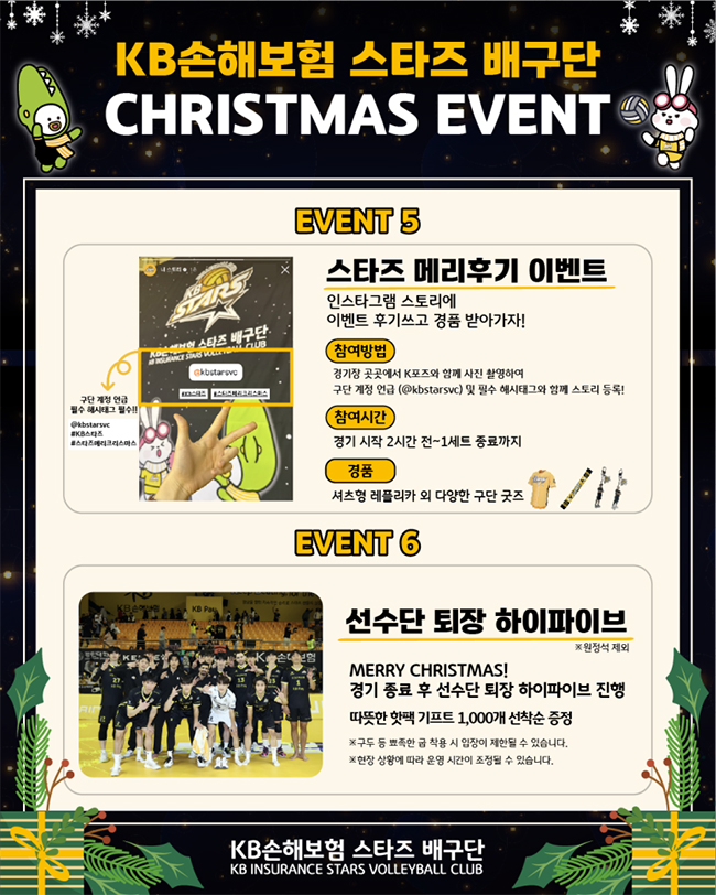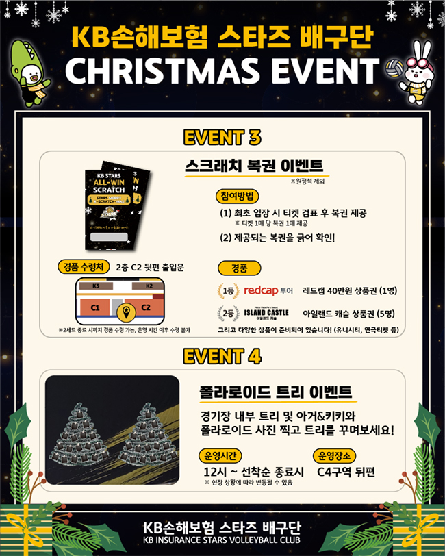 KB스타즈 𝑪𝑯𝑹𝑰𝑺𝑻𝑴𝑨𝑺 𝑬𝑽𝑬𝑵𝑻💛 💫 𝑬𝑽𝑬𝑵𝑻 ① 선수단 입장 이벤트 선수단이 산타로 변신해 입장합니다! 💫 𝑬𝑽𝑬𝑵𝑻 ② 멤버십 대상 하이파이브 진행 ※멤버십 카카오톡 채널 동해 당첨자 선정 및 개별 연락 💫 𝑬𝑽𝑬𝑵𝑻 ③ 스크래치 복권 이벤트 참여방법 (1) 최초 입장 시 티켓 검표 후 복권 제공 ※ 티켓 1매 당 복권 1매 제공 (2) 제공되는 복권을 긁어 확인! 💫 𝑬𝑽𝑬𝑵𝑻 ④ 폴라로이드 복권 이벤트 경기장 내부 트리 및 아거&키키와 폴라로이드 사진 찍고 트리를 꾸며보세요!📸 💫 𝑬𝑽𝑬𝑵𝑻 ⑤ 스타즈 메리후기 이벤트 인스타그램 스토리에 이벤트 후기쓰고 경품 받아가자! 💫 𝑬𝑽𝑬𝑵𝑻 ⑥ 선수단 퇴장 하이파이브 MERRY CHRISTMAS! 경기 종료 후 선수단 퇴장 하이파이브 진행 따뜻한 핫팩 기프트 1,000개 선착순 증정🔥