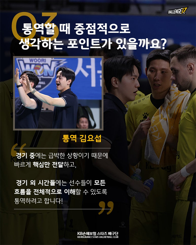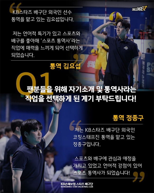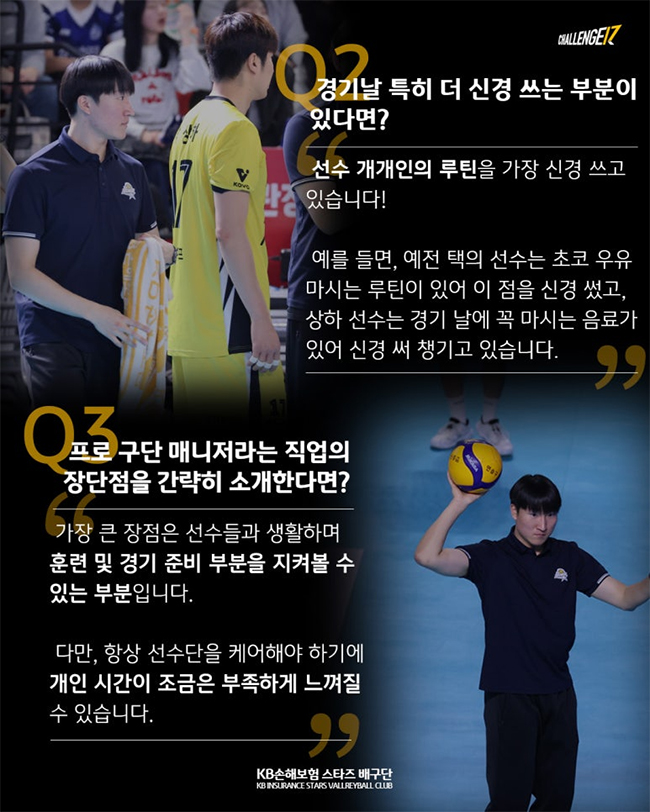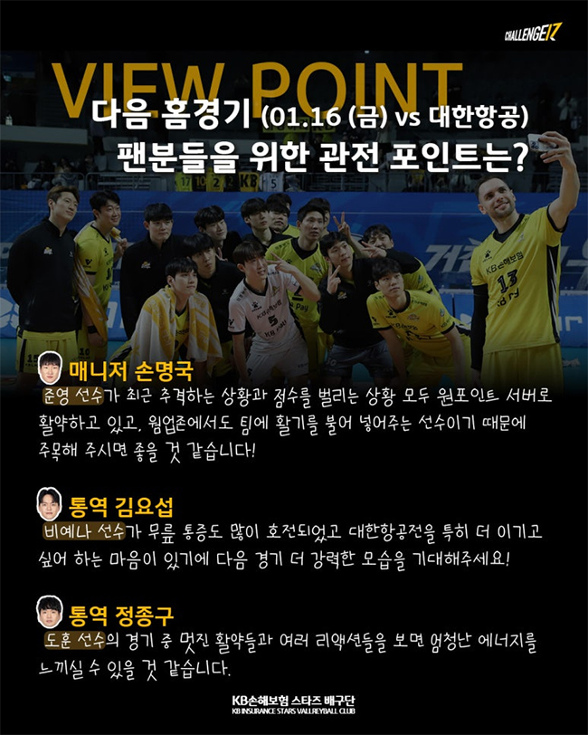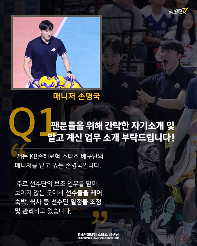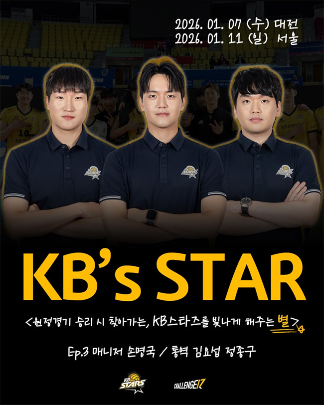 그 세번째 주인공은 손명국 매니저와 김요섭, 정종구 통역입니다!✨ 매 원정경기 승리 시마다 감독/코치진, 선수단, 팬 여러분 등 KB스타즈와 함께하는 누구든 챌린저17기가 찾아갑니다🏃➡️ 지난 4R 삼성화재, 우리카드전 찾아간 매니저와 통역! 그리고 과연 다음 원정 경기의 KB’s STAR 주인공은 누구일지~? #KB손해보험스타즈배구단 #남자배구 #KB스타즈 #손명국 #김요섭 #정종구 #챌린저17기 #KBsSTAR |