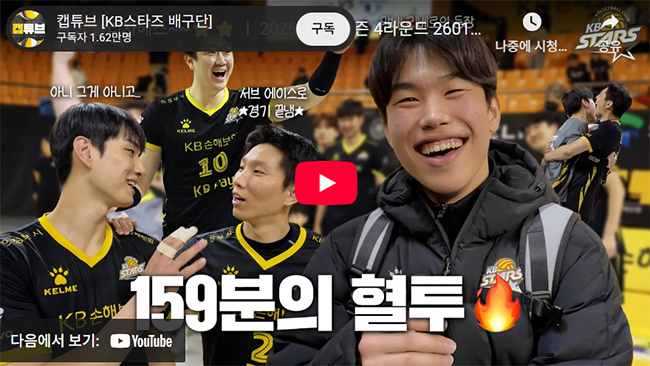 이번 시즌 최장 시간 경기!!! 159분의 혈투의 끝은?! 첫 볼터치부터 제대로 눈도장 찍은 학진이부터 서브 에이스로 끝낸 주장까지!!!!💛 지금 그 현장을 캡튜브에서 보시죠💛 #KB손해보험스타즈배구단 #KB스타즈배구단 #KB스타즈 #남자배구 #KBSTARS 구단 홈페이지 https://www.kbstarsvc.co.kr 인스타그램 https://www.instagram.com/kbstarsvc 네이버 TV https://tv.naver.com/kbstarsvc 네이버 블로그 https://blog.naver.com/kbstarsvc |