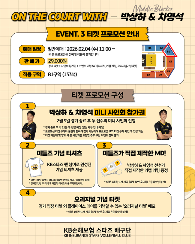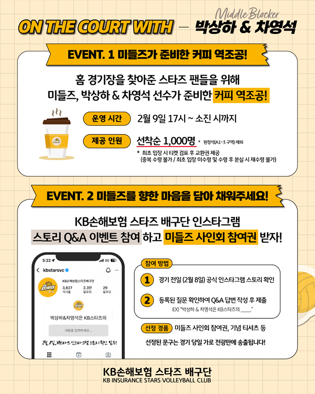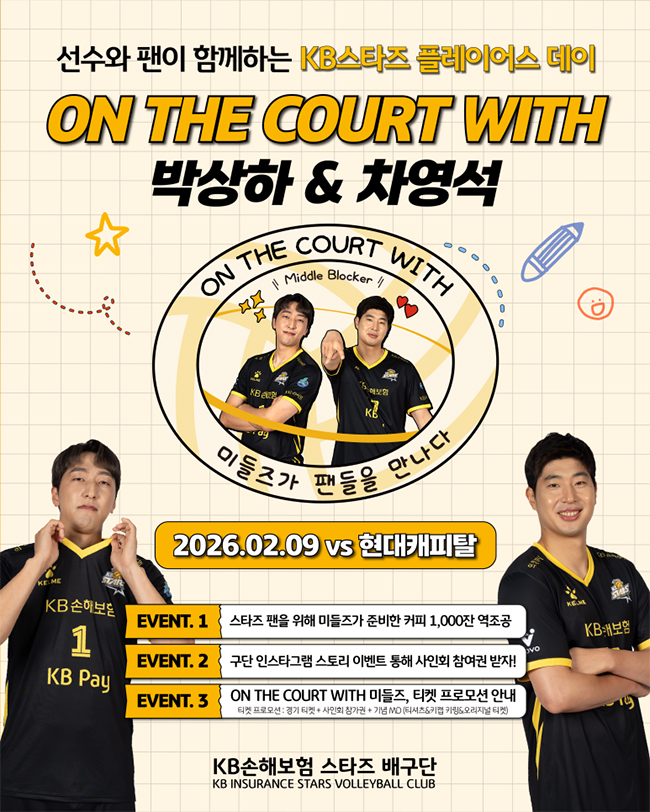 선수와 팬이 함께하는 'KB스타즈 플레이어스 데이' ON THE COURT WITH 박상하&차영석 (2026.02.09 vs현대캐피탈) ● EVENT 1. 미들즈가 준비한 커피 역조공! 운영 시간 : 2월 9일 17시 ~ 소진 시까지 제공 인원 : 선착순 1,000명 * 최초 입장 시 티켓 검표 후 교환권 제공 (중복 수령 불가 / 최초 입장 미수령 및 수령 후 분실 시 재수령 불가) * 원정석 (A1~3 구역) 제외 ● EVENT 2. 미들즈를 향한 마음을 담아 채워주세요! 참여 방법 : 1) 경기 전일 (2월 8일) 공식 인스타그램 스토리 확인 (@kbstarsvc) 2) 등록된 질문 확인하여 Q&A 답변 작성 후 제출 선정 경품 : 미들즈 사인회 참여권, 기념 티셔츠 등 * 선정된 문구는 경기 당일 가로 전광판에 송출됩니다. ● EVENT 3. 티켓 프로모션 안내 예매 일정 : 일반예매 2026년 2월 4일 (수) 11시 ~ *본 프로모션은 선에매 적용이 불가합니다. 판매가 : 29,000원 * 경기 티켓+사인회 참가권+이벤트 기념 MD(티셔츠, 키캡 키링, 오리지널 기념 티켓) 적용 구역 : B1구역 (133석) 자세한 내용은 카드뉴스 참고해 주세요! KB스타즈 플레이어스 데이 팬 여러분들의 많은 관심과 참여 부탁드리겠습니다! |