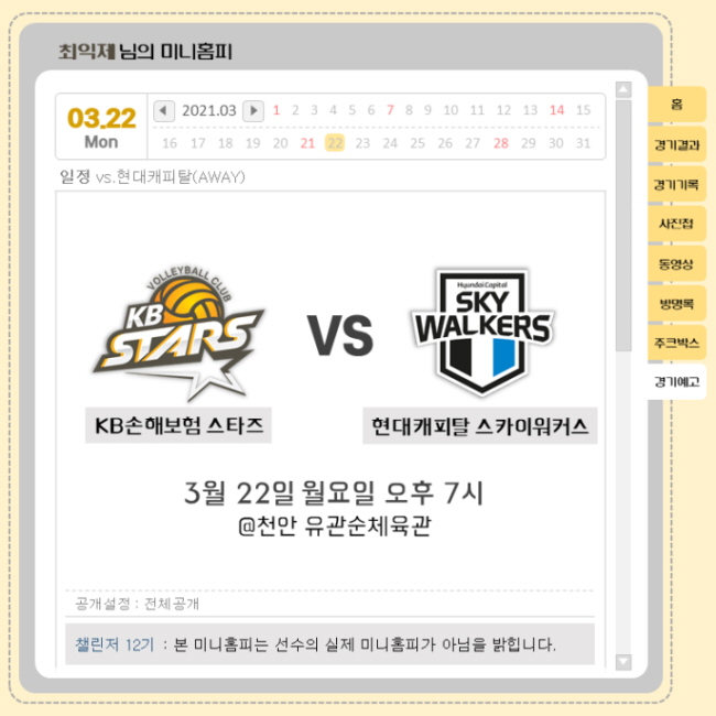 풀세트 접전 끝에 승점 2점을 획득하며 2위에 조금 더 가까워진 오늘 경기을 기록한 팡팡 플레이어 최익제 선수의 미니홈피
