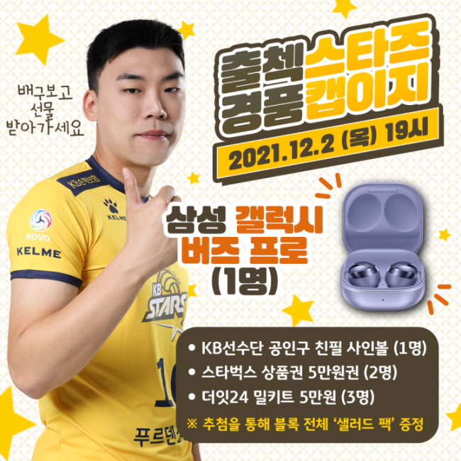 #출첵 #경품 #12월2일 #19시 #의정부체육관 #갤럭시버즈프로 #다양한 #선물 #KB스타즈배구단 #캡이지 |