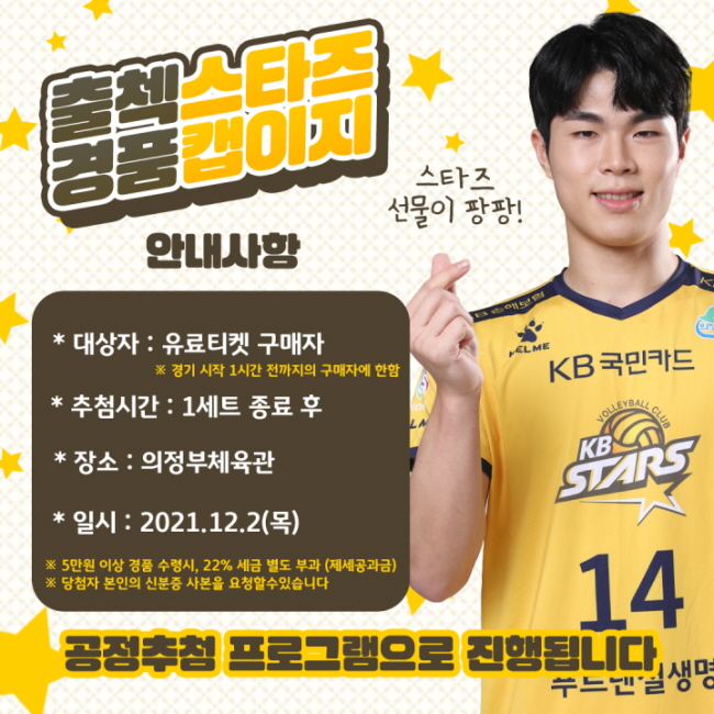 대상자 : 유료티켓 구매자 (경기 시작 1시간 전 구매자에 한함) 추첨 시간 : 1세트 종료 후 장소 : 의정부체육관 일시 : 2021.12. 2(목)