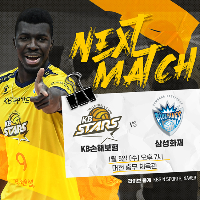 ★의정부 KB손해보험 스타즈 배구단★ "2021-2022시즌 4라운드 2번째 원정경기 안내" 1월 5일 19시에 대전충무체육관에서 원정 경기가 진행됩니다. 우리 선수들이 힘낼 수 있게 많은 응원 부탁드립니다❗ -2021년 1월 5일(수) 19:00 -장소 : 대전충무체육관 (vs삼성화재) -중계 : KBS N SPORTS, NAVER [녹화방송] SBS SPORTS 1월 6일(목) 07:55 [재방송] KBS N SPORTS 1월 6일(목) 06:00